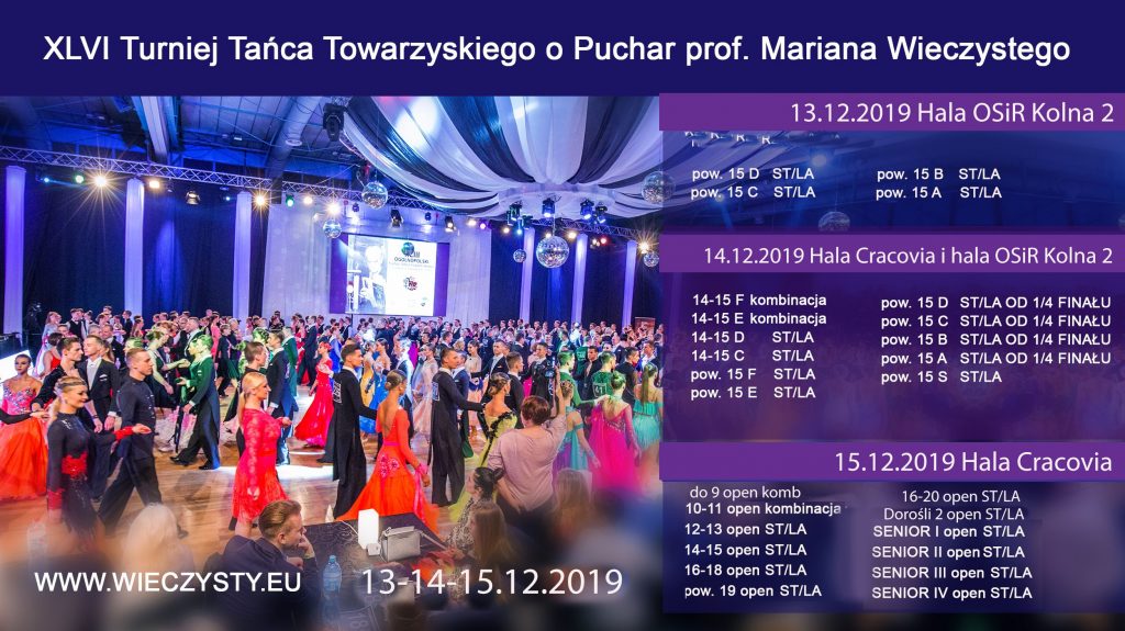 Jak co roku, polecamy Państwu wielkie wydarzenie taneczne jakim jest 46 Ogólnopolski Turniej Tańca Towarzyskiego „O Puchar Prof. Mariana Wieczystego” w Krakowie. To prawdziwe święto tańca – 3 dni eliminacji, emocji, rywalizacji, finałów i sukcesów na parkiecie!